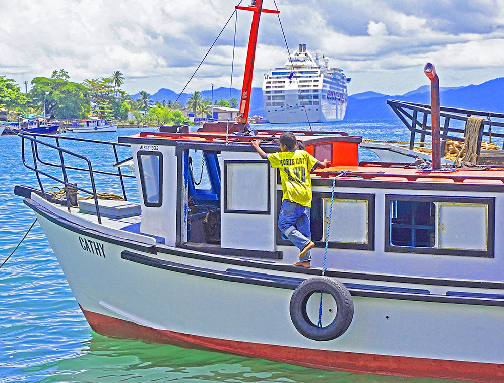 Alotau is an island in the Milne Bay province of Papua New Guinea that is a port for cruise ships, mainly from Australia, such as the Sea Princess seen in the background of the photo.